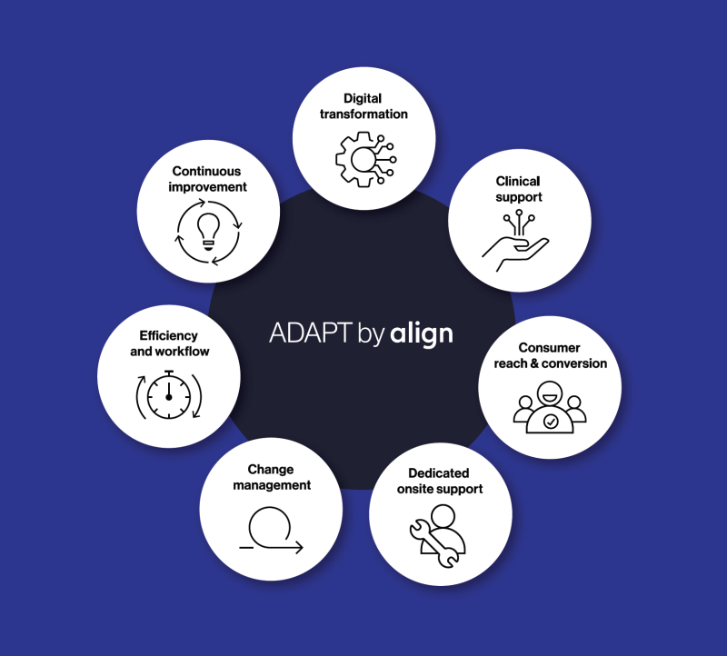 ADAPT er en helhetlig, svært personlig tilpasset, forretningsoptimalisert ettersalgsstøtte som kombinerer dine data og erfaring med vår ekspertise for å transformere praksisen din. ADAPT er et eget gebyrbasert konsulentselskap. Som et resultat av ADAPT-servicen opplevde deltakende praksiser en gjennomsnittlig økning på den totale fortjenesten per tilfelle med 15 % innen 6 måneder med implementering. Det er en datadrevet, avgiftsbasert konsulentservice som er designet for å optimalisere flyten din.7